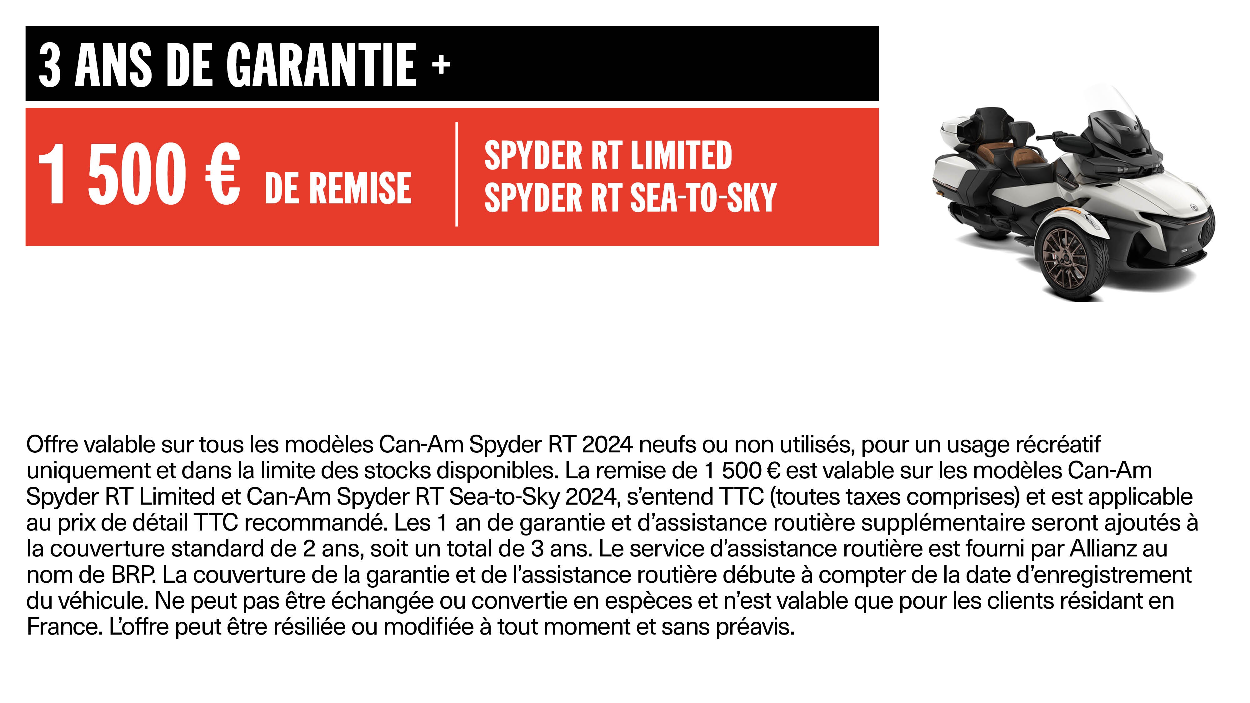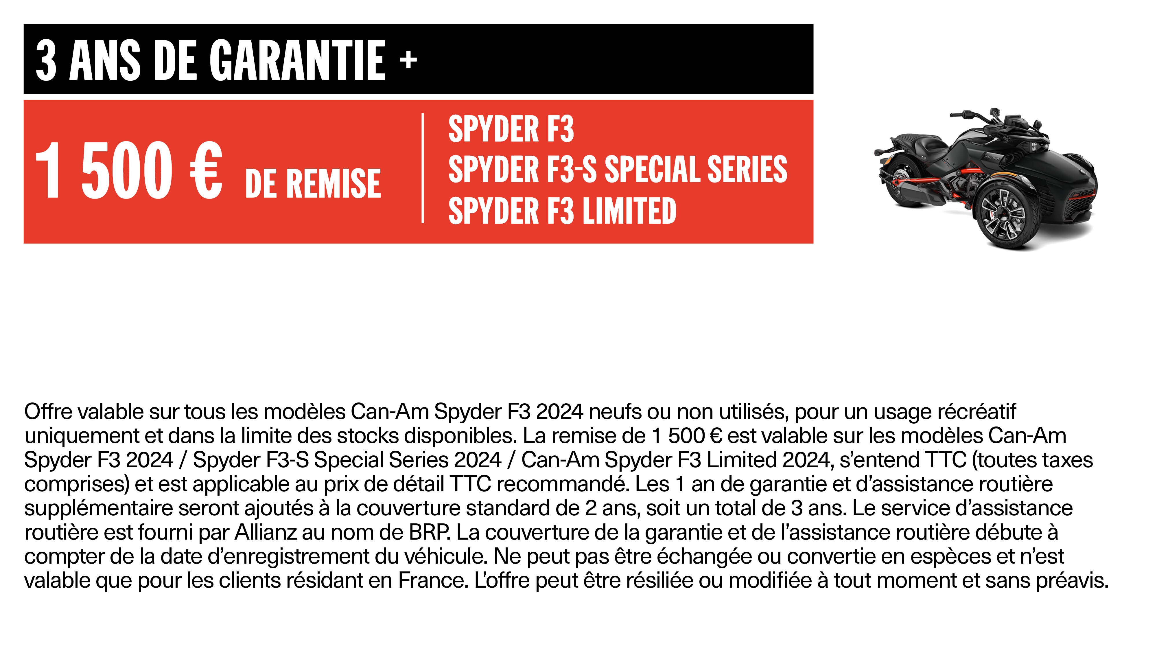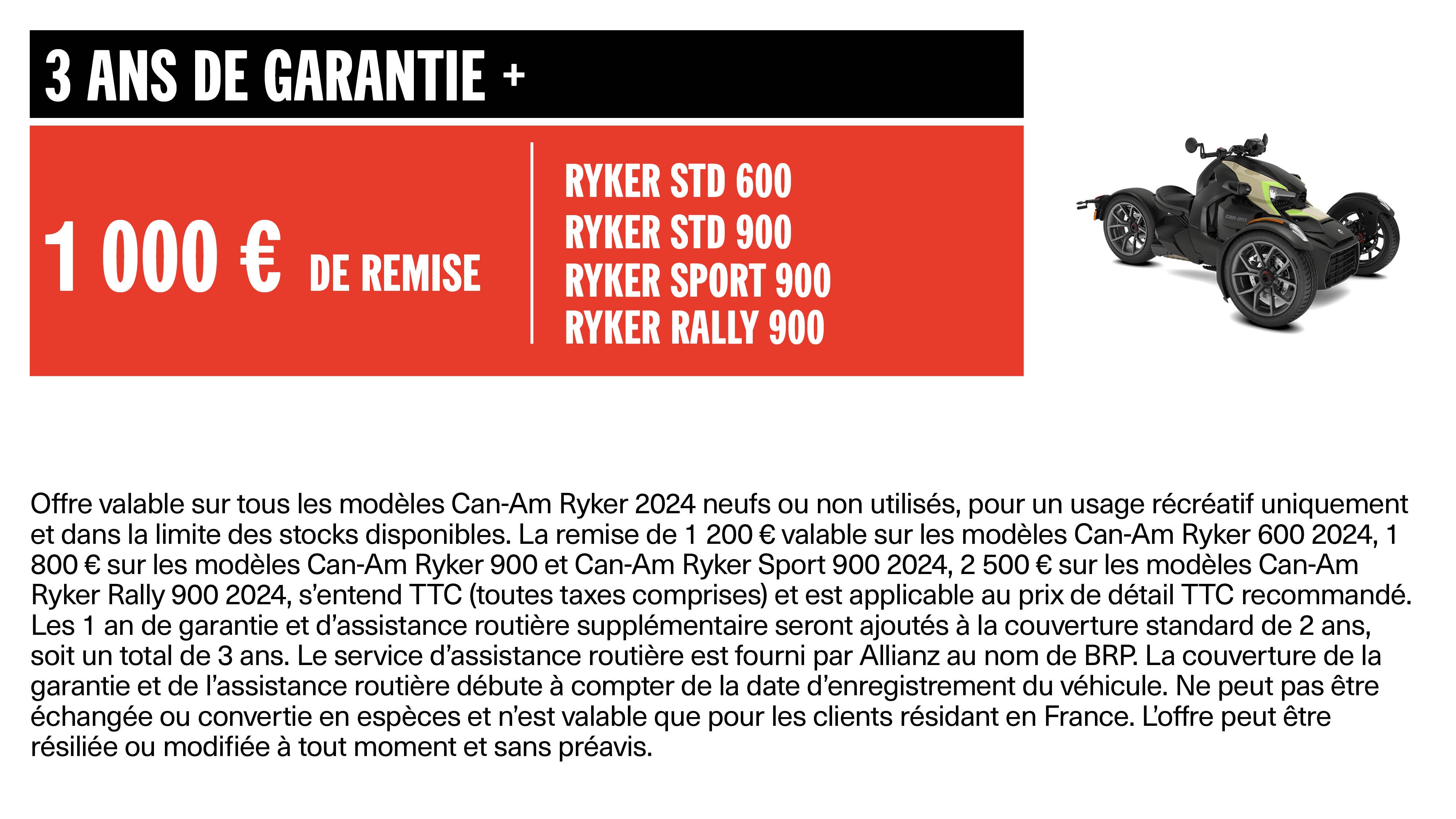 Cette offre est valable sur les nouveaux modèles sélectionnés Can-Am non utilisés enregistrés entre 01.09.2025 et 31.01.2026 par un concessionnaire participant. L'offre s'applique aux enregistrements pour un usage récréatif uniquement et dans la limite des stocks disponibles. La valeur de la remise s'applique au prix de vente conseillé (MSRP) incluant la TVA. La garantie commence à partir de la date d'enregistrement du véhicule. L'offre ne peut être remplacée ni convertie en espèces et est uniquement valable pour les clients résidant en France et Belgique. Les concessionnaires peuvent vendre à un prix différent. Pour des informations complètes et précises sur le prix des véhicules, veuillez contacter votre concessionnaire local. L'offre est sujette à résiliation ou modification à tout moment sans préavis.
