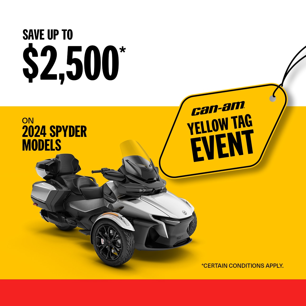 ©2026 Bombardier Recreational Products Inc. (BRP). All rights reserved. ®, ™ and the BRP logo are trademarks of BRP or its affiliates. Offers valid in Canada at participating dealerships only from February 1, 2026 to April 30, 2026. Conditions may vary depending on your location and this offer is subject to termination or change at any time without notice. This offer is not refundable, exchangeable or transferable (including from one dealership to another), cannot be redeemed for cash, credit or other products of equivalent value and cannot be combined with any other offer or rebate. Null where prohibited by law. Until supplies last. Returns of any portion of the purchase will require equal forfeiture of offer or amount equal to the offer. Eligible models are all new and unused 2024 Can-Am Spyder. Other Can-Am On-Road models may qualify for other promotions, see local dealers for details.