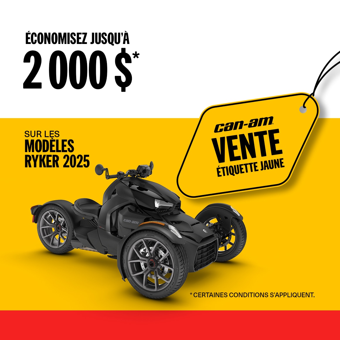 Préparez‑vous pour la saison avec un nouveau véhicule Can‑Am. Durant la Vente Étiquette Jaune, vos modèles favoris sont en solde.