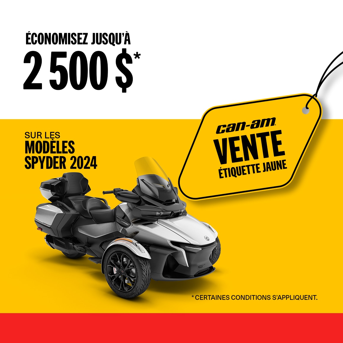 ©2026 Bombardier Produits Récréatifs inc. (BRP). Tous droits réservés. ®, MC et le logo BRP sont des marques de commerce de BRP ou de ses sociétés affiliées. Cette offre est valide au Canada seulement chez les concessionnaires participants du 1ᵉʳ février 2026 au 30 avril 2026. Les conditions peuvent varier en fonction de votre lieu de résidence et cette offre peut prendre fin ou être modifiée à tout moment sans préavis. L’offre n'est pas remboursable, échangeable ou transférable (y compris d'un concessionnaire à un autre), ne peut être échangée contre de l'argent, un crédit ou d'autres produits de valeur équivalente et ne peut être combinée avec aucune autre offre ou remise. L’offre est nulle là où la loi l’interdit. Jusqu'à épuisement des stocks. Tout retour, même partiel, de l'achat entraînera la perte d'une partie équivalente de l'offre ou d'un montant égal à celui-ci. Les unités éligibles sont tous les modèles Can-am Spyder 2024 neufs et inutilisés. D'autres modèles Can-Am On-Road peuvent être admissibles à d'autres rabais. Consultez votre concessionnaire local pour plus de détails.