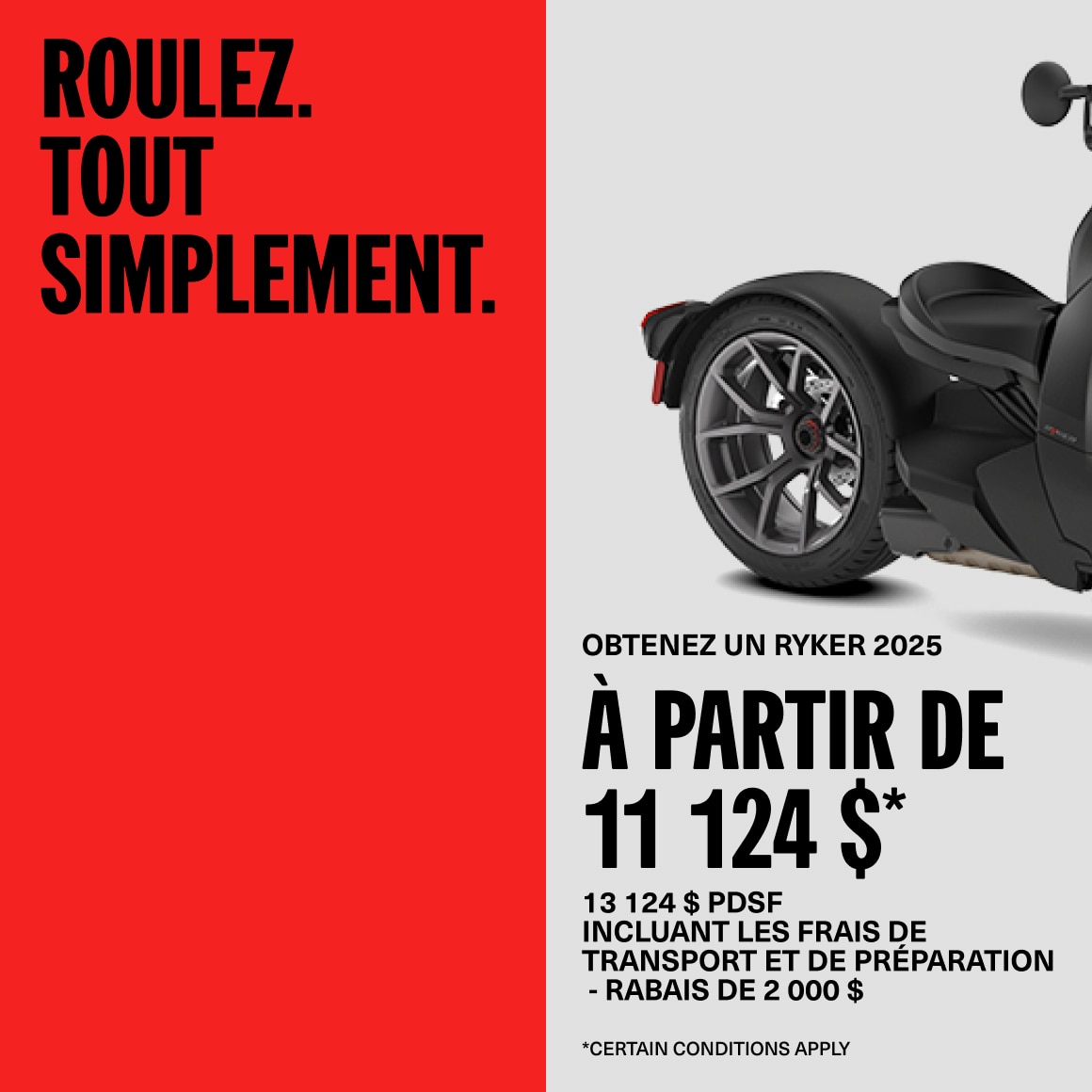 ©2026 Bombardier Produits Récréatifs inc. (BRP). Tous droits réservés. ®, MC et le logo BRP sont des marques de commerce de BRP ou de ses sociétés affiliées. Cette offre est valide au Canada seulement chez les concessionnaires participants du 1ᵉʳ février 2026 au 30 avril 2026. Les conditions peuvent varier en fonction de votre lieu de résidence et cette offre peut prendre fin ou être modifiée à tout moment sans préavis. L’offre n'est pas remboursable, échangeable ou transférable (y compris d'un concessionnaire à un autre), ne peut être échangée contre de l'argent, un crédit ou d'autres produits de valeur équivalente et ne peut être combinée avec aucune autre offre ou remise. L’offre est nulle là où la loi l’interdit. Jusqu'à épuisement des stocks. Tout retour, même partiel, de l'achat entraînera la perte d'une partie équivalente de l'offre ou d'un montant égal à celui-ci. Les unités éligibles sont tous les modèles Can-am Ryker 2025 neufs et inutilisés. D'autres modèles Can-Am On-Road peuvent être admissibles à d'autres rabais. Consultez votre concessionnaire local pour plus de détails.