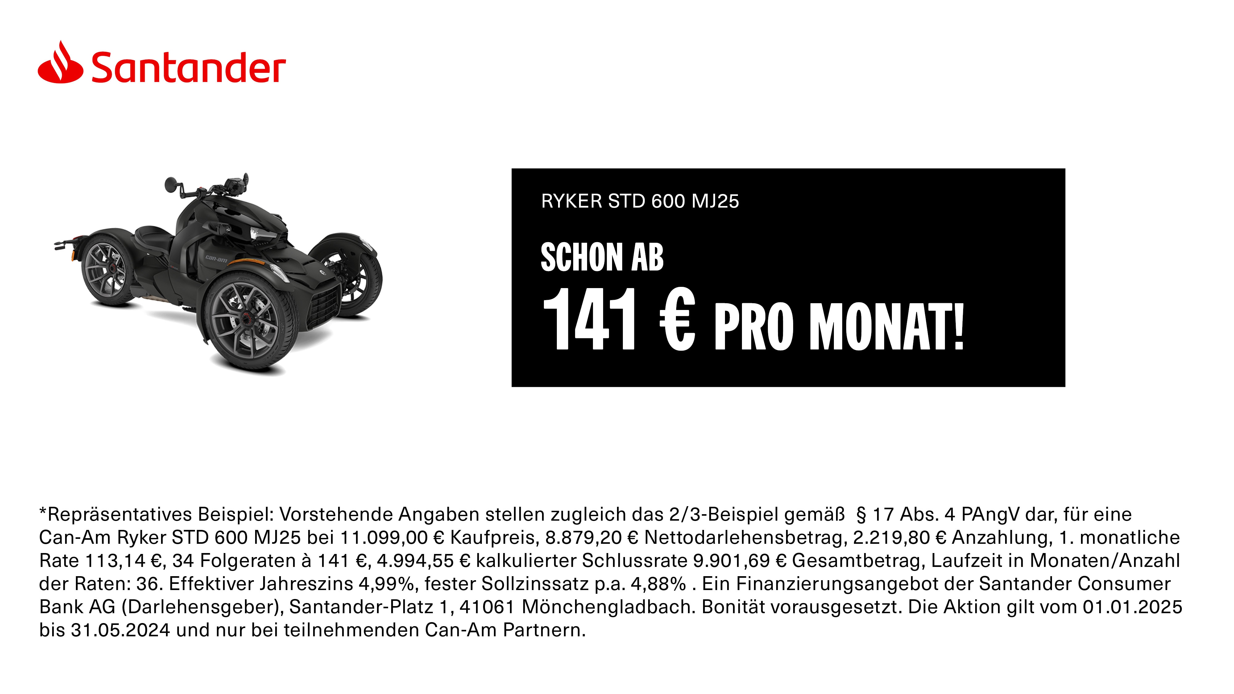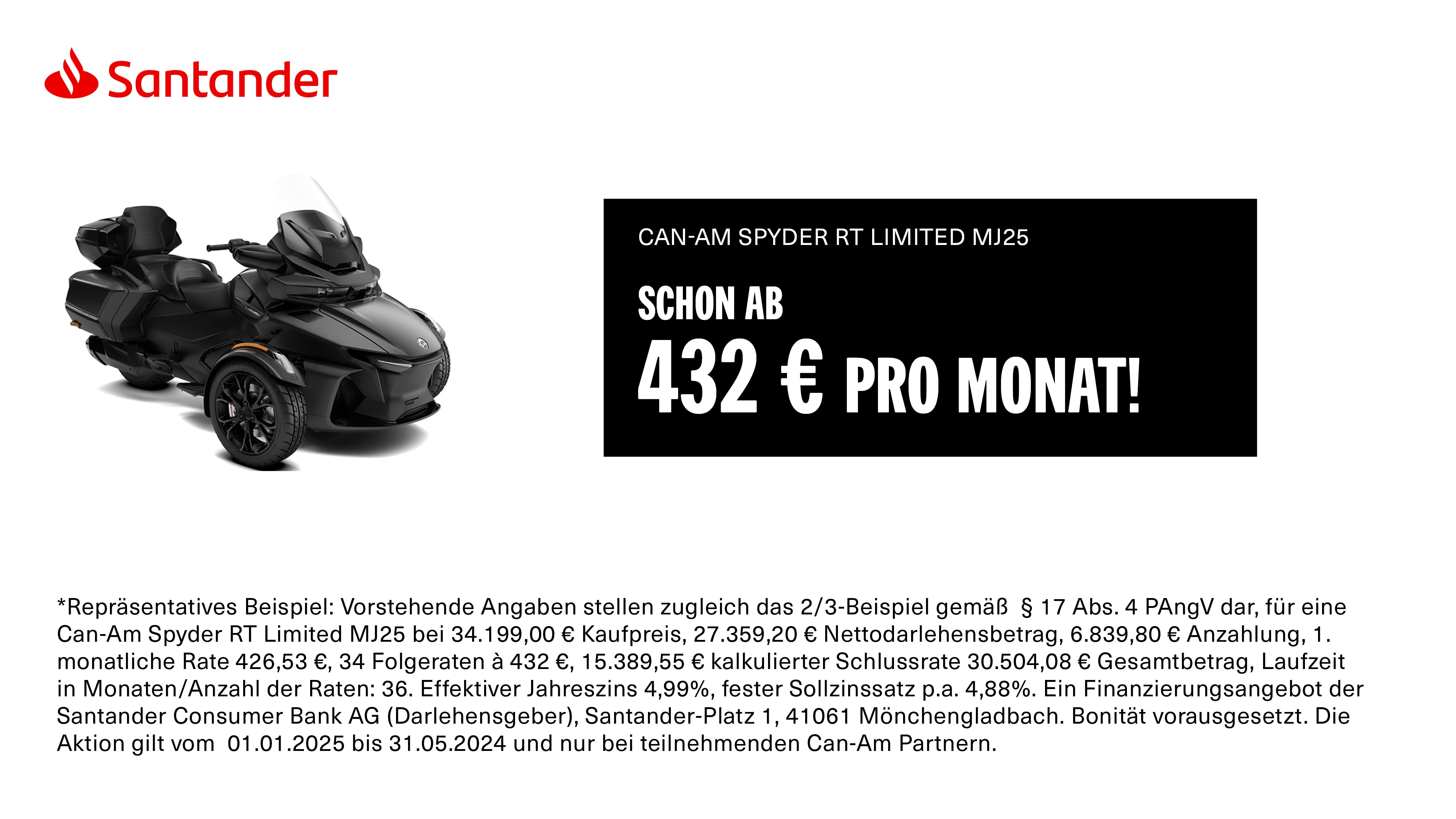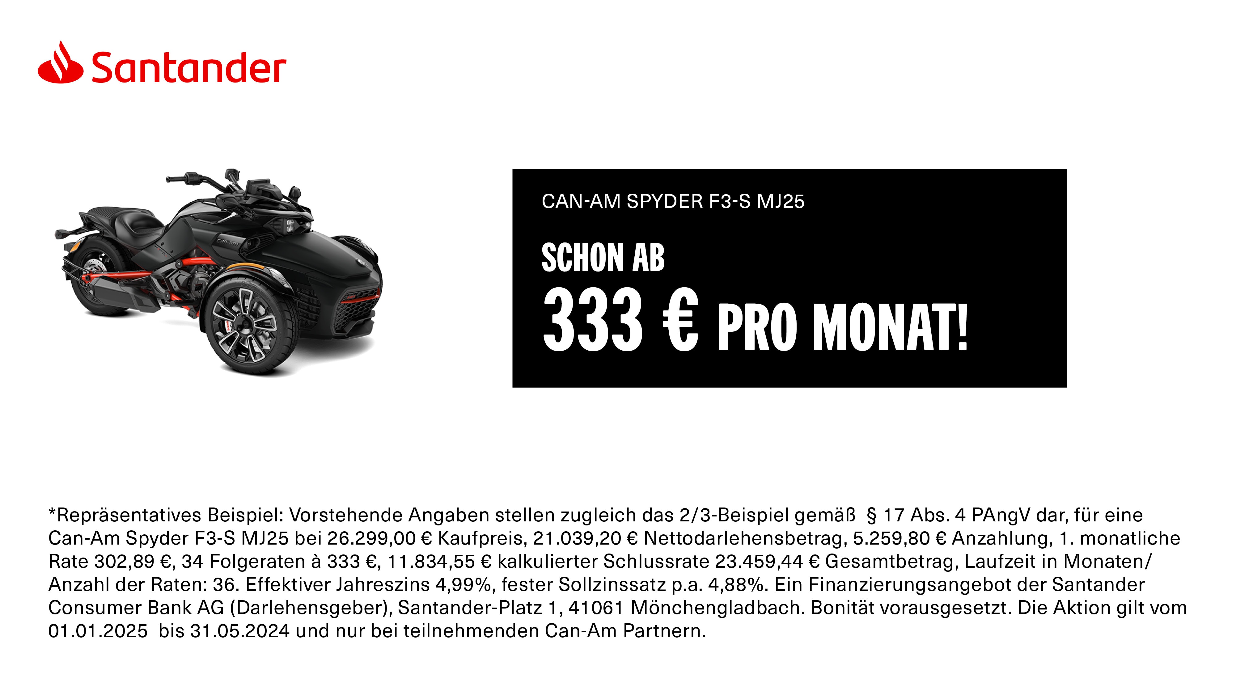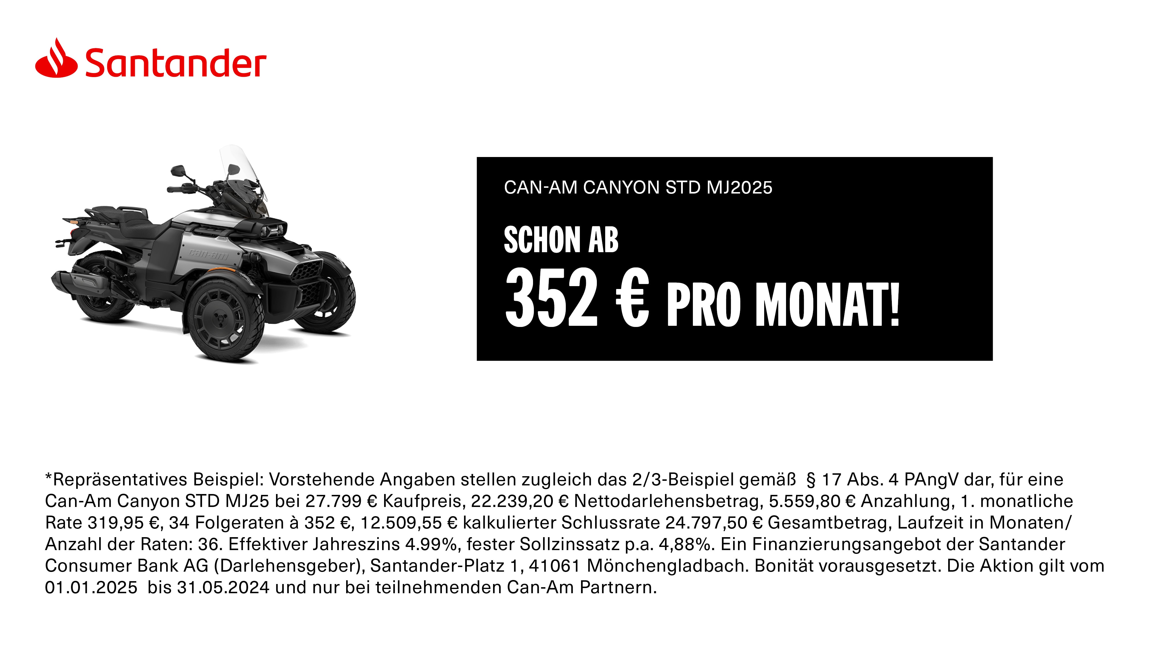 Unser Finanzierungspartner, die Santander Consumer Bank, bietet verschiedene Optionen an, die es Ihnen bequem und erschwinglich machen, ein Can-Am zu besitzen.