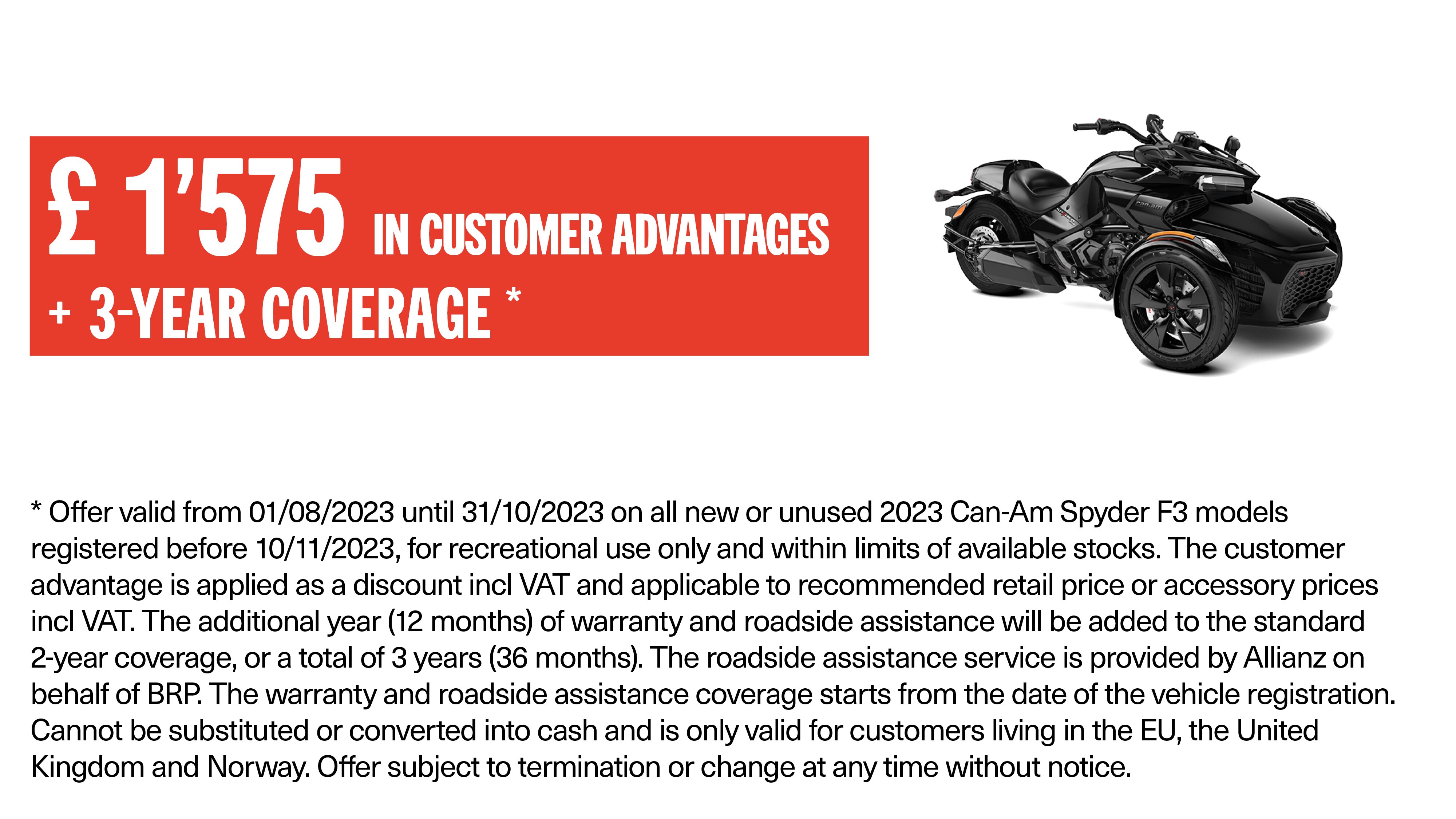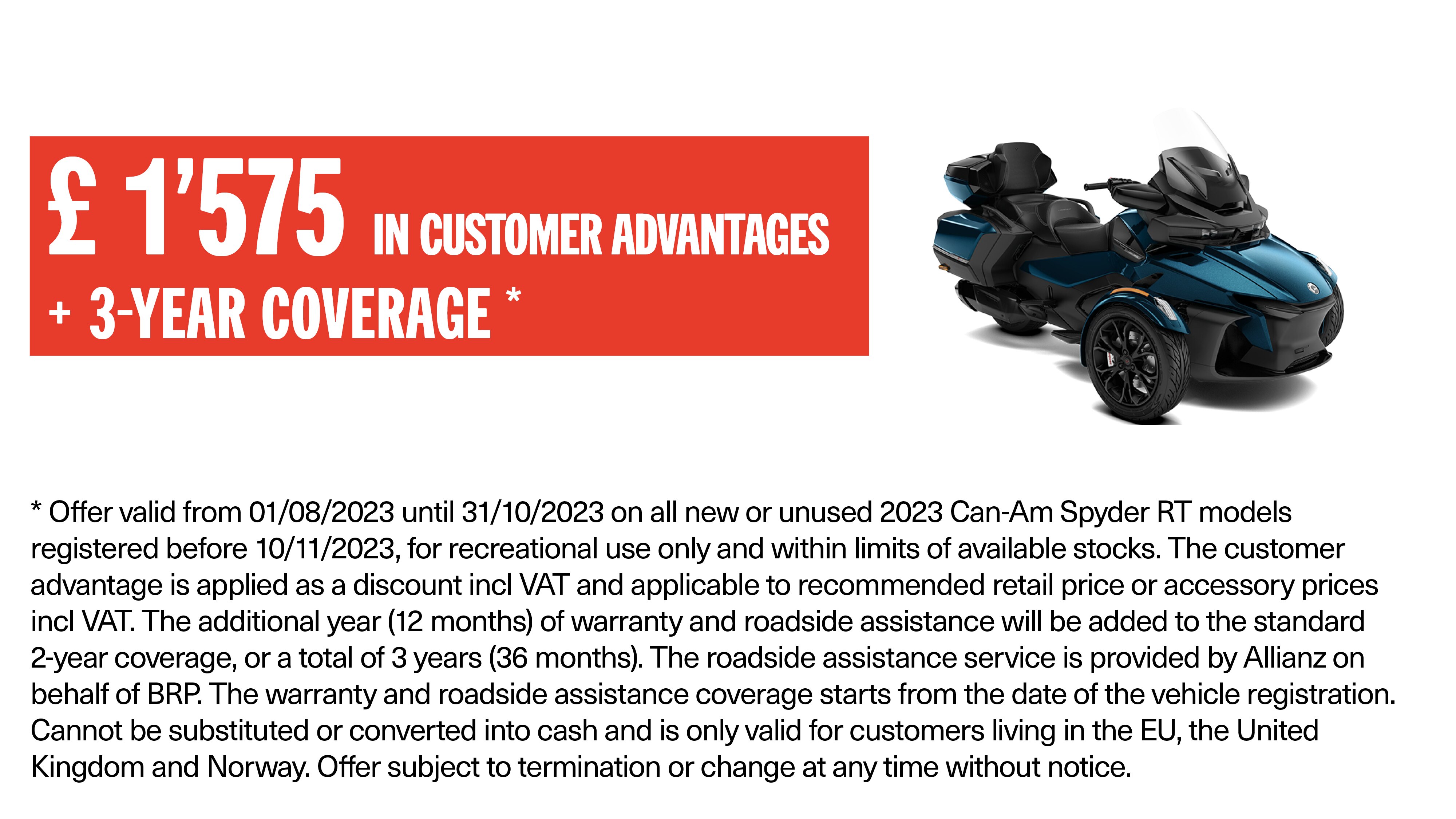 This offer is valid on the new or unused selected Can-Am models registered between 01.09.2025 and 31.01.2026 by a participating dealer. Offer applicable to registrations for recreational use only and within limits of available stocks. The discount value is applicable to the MSRP including VAT. The warranty starts from the date of the vehicle registration. The offer cannot be substituted or converted into cash and is only valid for customers living in the United Kindgom. Dealers may sell for a different price. For full and accurate vehicle pricing information, please contact your local Dealer. Offer subject to termination or change at any time without prior notice.